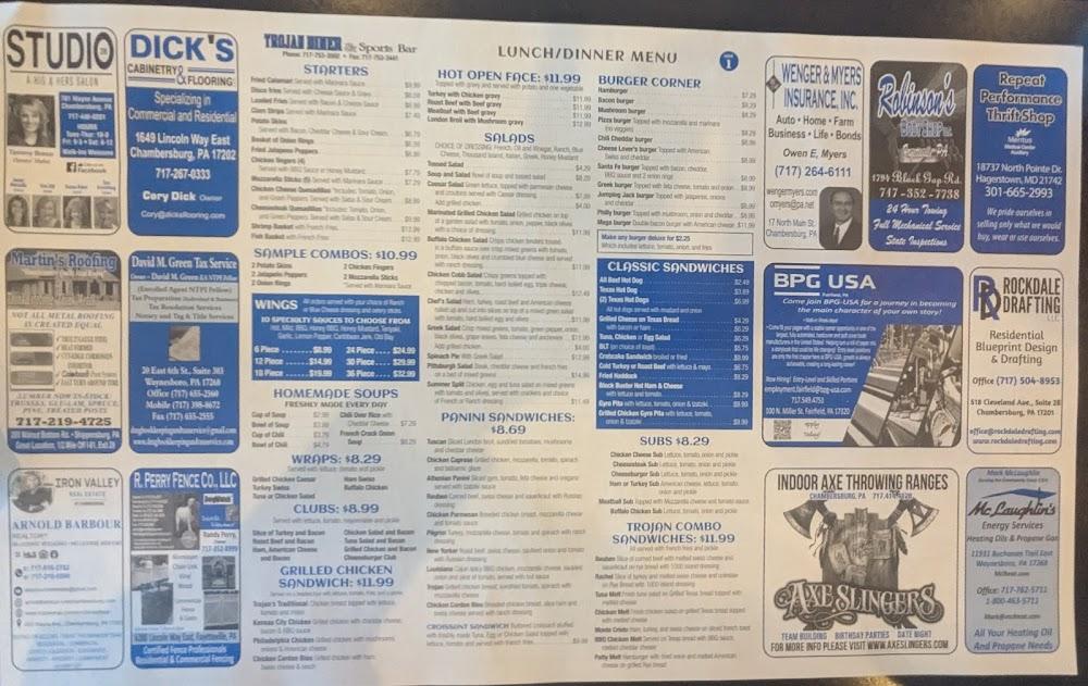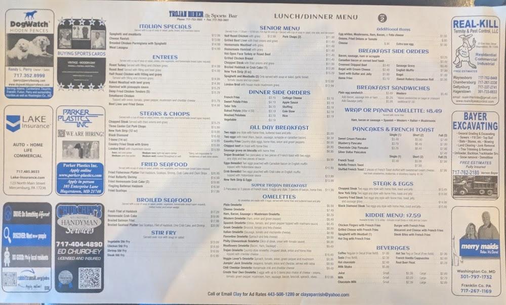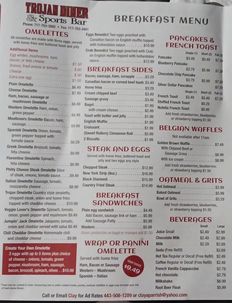 Welcome to Trojan Diner and Sports Bar, your go-to spot for a delicious meal and an exciting sports atmosphere in Chambersburg, PA. Located at 1121 Lincoln Way E, we offer a diverse menu featuring traditional diner favorites, local specialties, and a great selection of beers and cocktails. Whether you're here for breakfast, lunch, or dinner, our speedy service and cozy ambiance ensure a memorable dining experience. Enjoy takeout, delivery, or dine-in with wheelchair accessibility and happy hour specials. Join us for the game and indulge in our decadent desserts and shareable plates at Trojan Diner and Sports Bar!